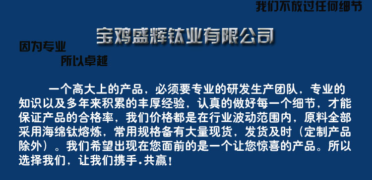 寶雞盛輝鈦業有限公司是一家主要從事鈦及鈦合金棒,鈦環,鈦法蘭及鈦合金板材的高新技術企業,公司提供鈦環,鈦合金棒批發,鈦環的生產工藝服務,以人為本,質量取勝為宗旨:18791863990,18740375975